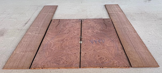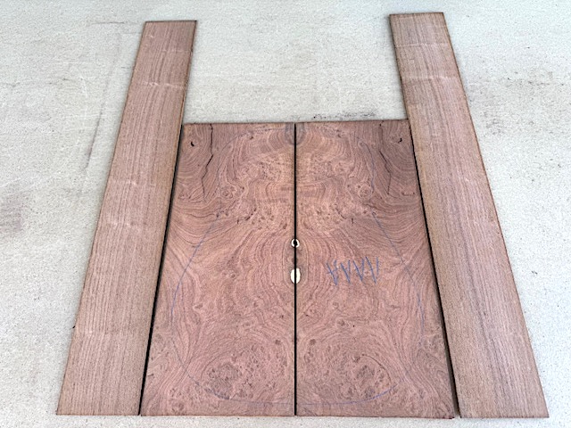 One gorgeous AAAA Mesquite guitar set; dreadnought. Sides sanded to 1/8" and measure 5" x 34-3/8". Backs sanded to 3/16" and measure 9-1/8" x 21-7/8". Photos are of the actual set you will receive, and this is just one of three sets currently available.