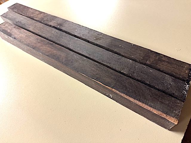 THREE African Blackwood turning squares, measuring 1-1/2" sq. x 22-1/2" & 21-7/8" & 20-1/8". Air-dried (for many years) and end-sealed with wax. Photos are of the actual pieces you will receive! Many other 1-1/2" squares (and other sizes) available, so if you need more than just these two pieces, please see out other listings.